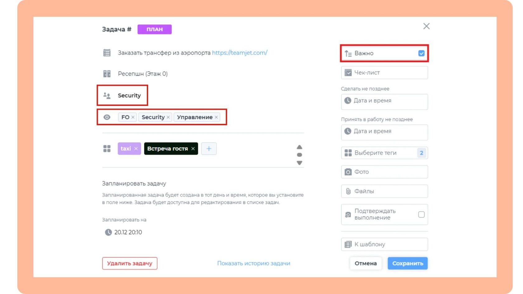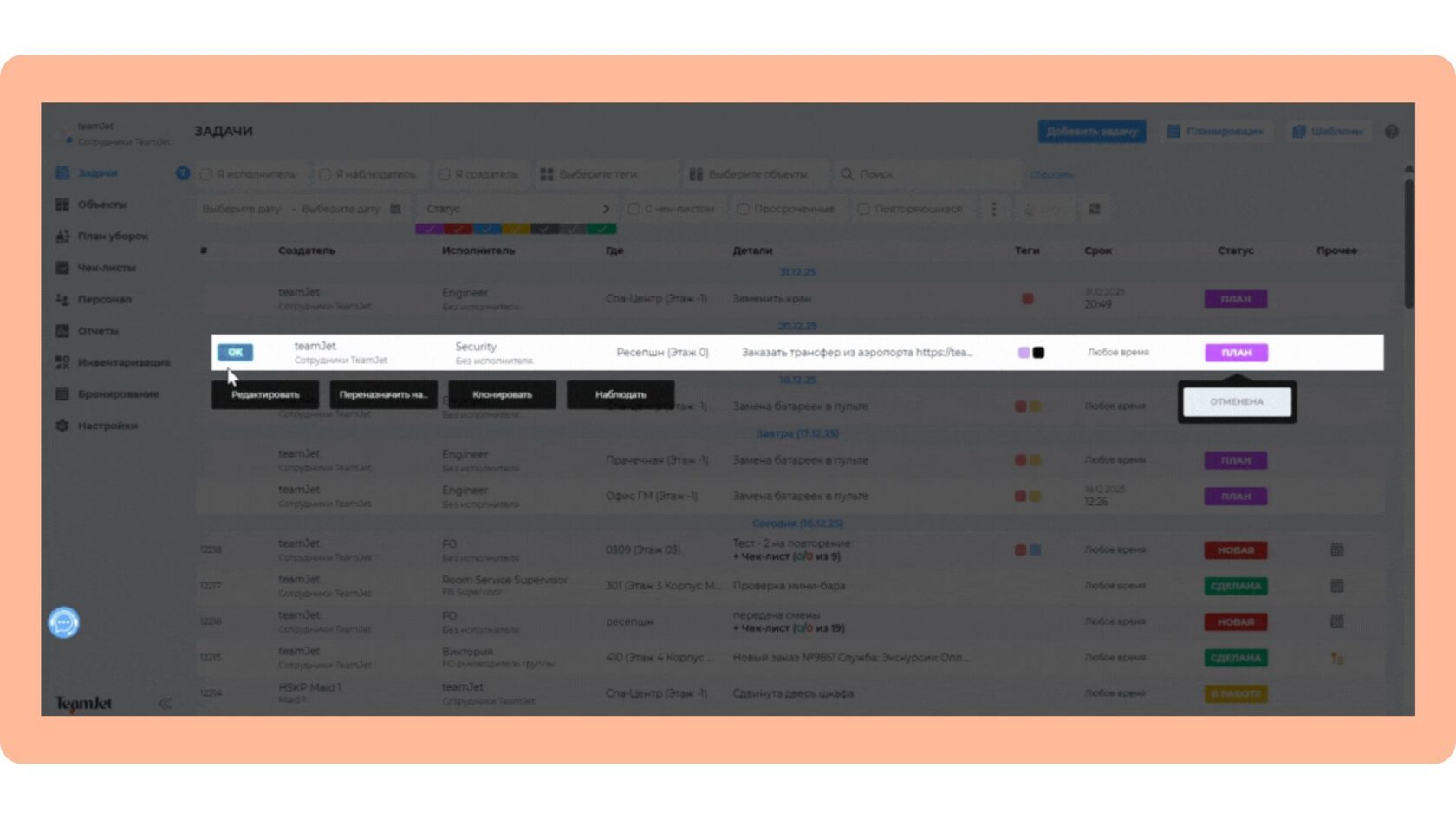 До момента активации задачу можно отредактировать, переназначить или отменить. Права на управление имеют создатель задачи, руководители с полными правами и руководители подразделений. Например, если изменились обстоятельства, администратор может перенести задачу по подготовке номера для VIP-гостя, а горничная, как исполнитель, не имеет права вносить такие изменения. Это обеспечивает баланс между гибкостью и сохранением контроля над важными процессами.