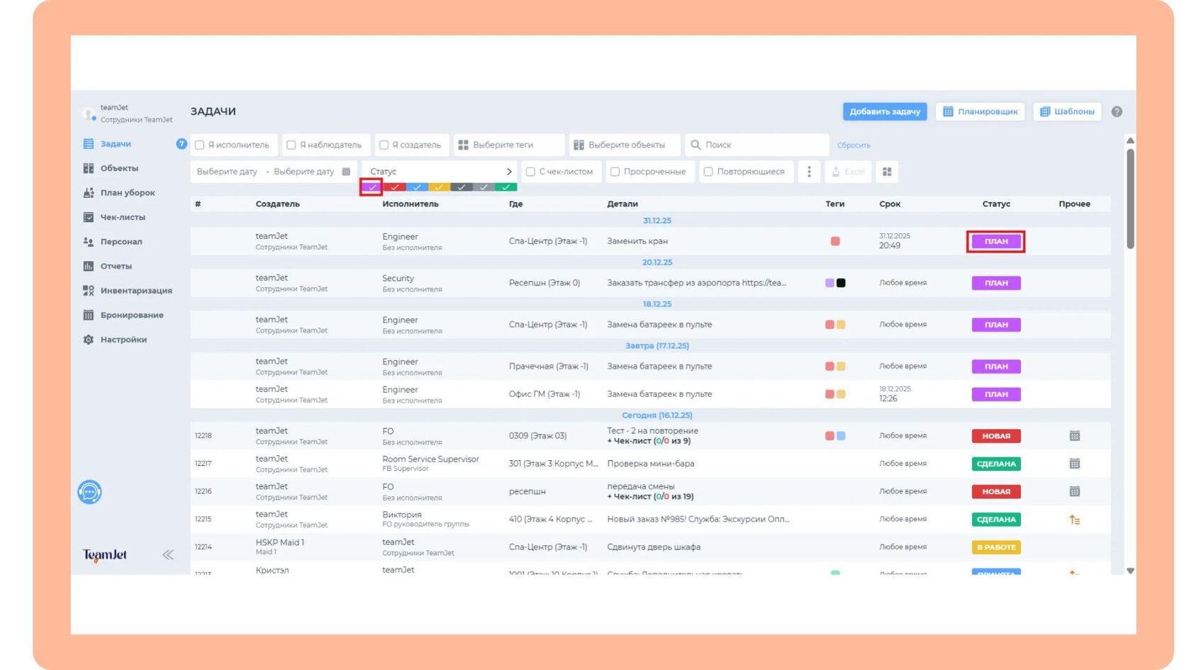 TeamJet постоянно совершенствуется, чтобы становиться еще удобнее для отельеров. Сегодня рассказываем о новой функции, которая позволяет планировать задачи с точной датой и временем выполнения — это еще один шаг к эффективному и предсказуемому управлению операционными процессами.